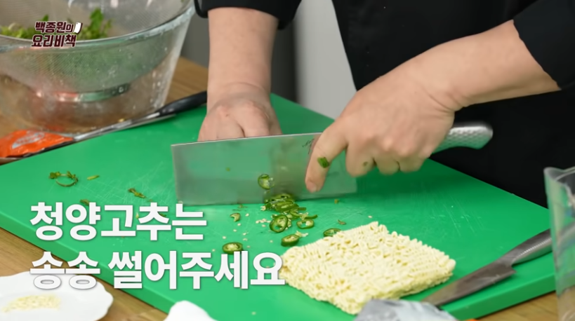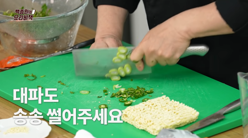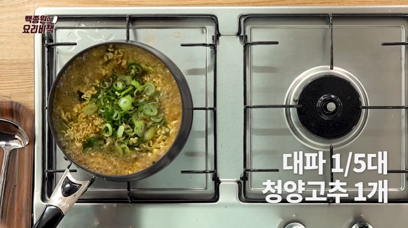 면이 전체적으로 한 가닥씩 풀리면 대파, 청양고추를 넣고 약 1분 정도 더 끓인 후 완성한다.