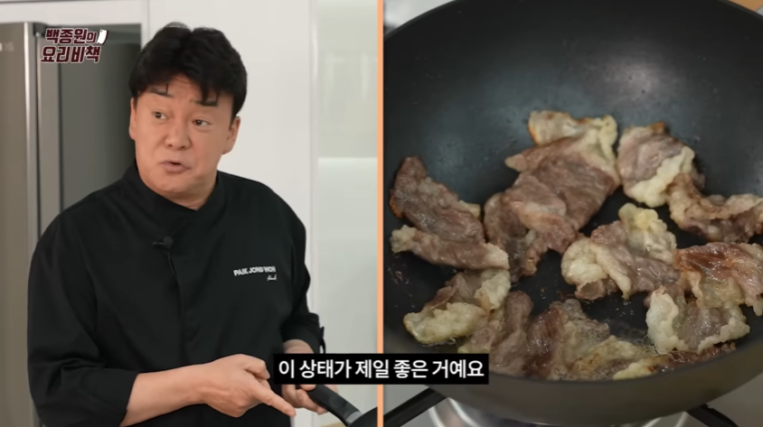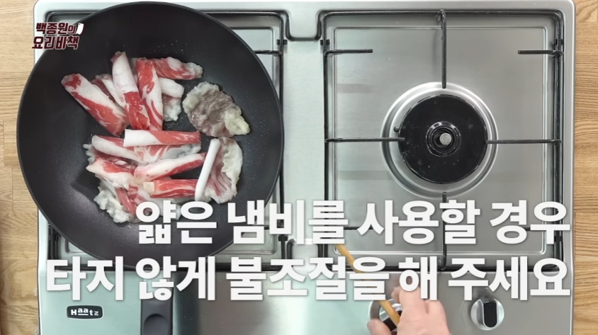 냄비에 차돌박이를 넣고 강불에 올린 후 노릇노릇하게 익어 기름이 나올 때까지 굽는다.