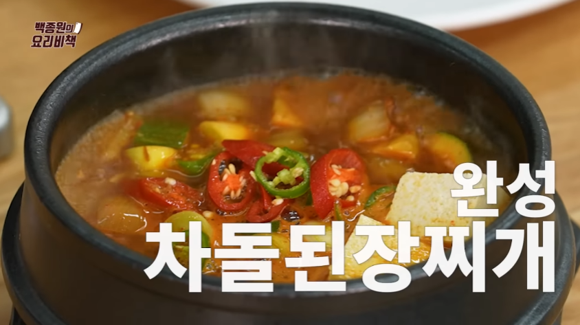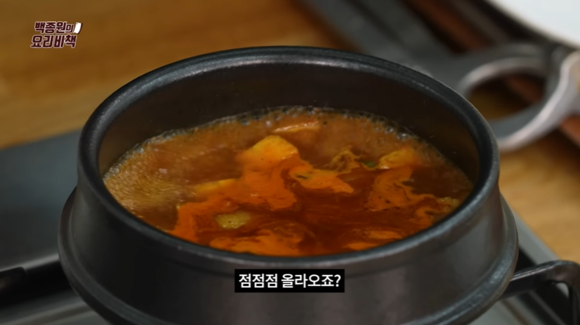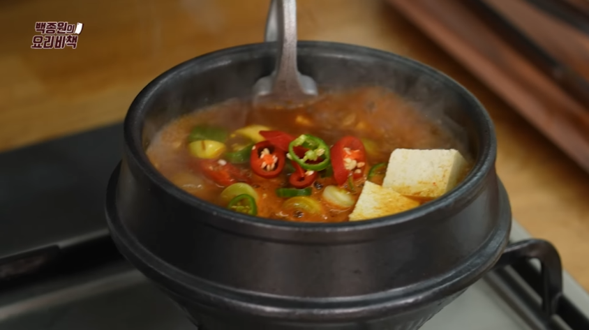 뚝배기에 1/2 양을 옮겨 담아 강불에 올린 후 끓어오르면 불을 끄고 두부, 대파, 청양고추, 홍고추 1/2양을 넣어 완성한다.
