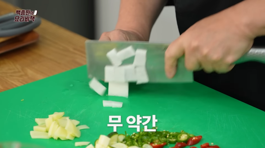 무는 감자와 같은 모양으로 자른 후 두께 0.3cm로 편 썰어 준비한다.
