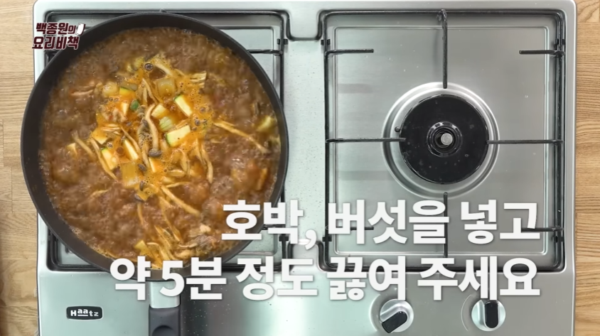 국물이 다시 한번 끓어오르면 느타리버섯, 애호박을 넣고 약 5분 정도 끓인다.