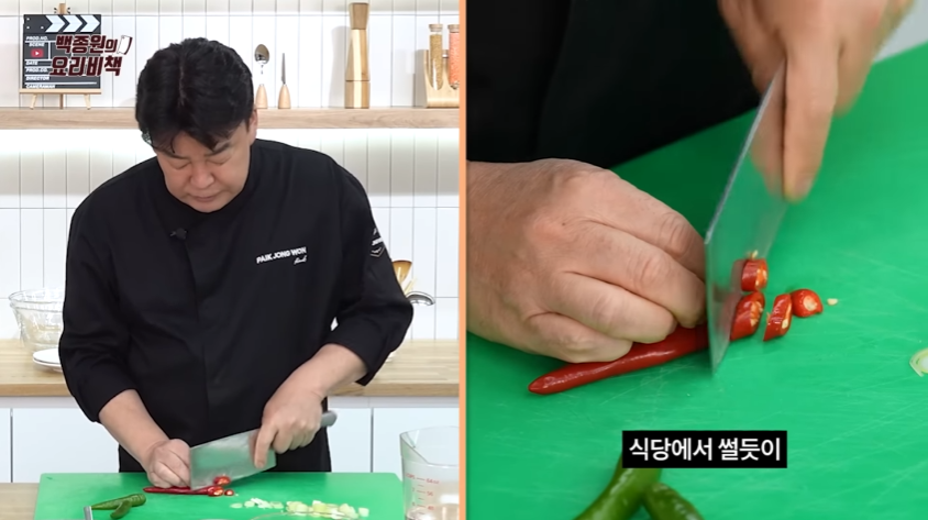 홍고추는 두께 0.5cm로 어슷 썰고, 청양고추는 두께 0.3cm로 송송 썬다.