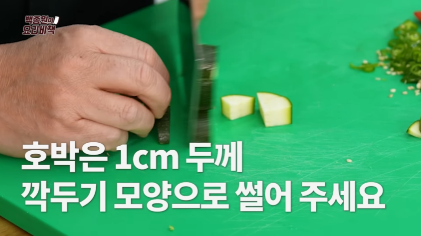 주키니 호박은 세로로 반 갈라 3등분으로 자른 후 두께 1cm로 썰어 준비한다.
