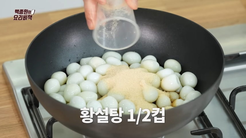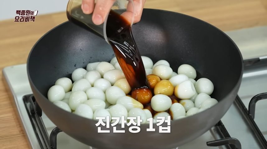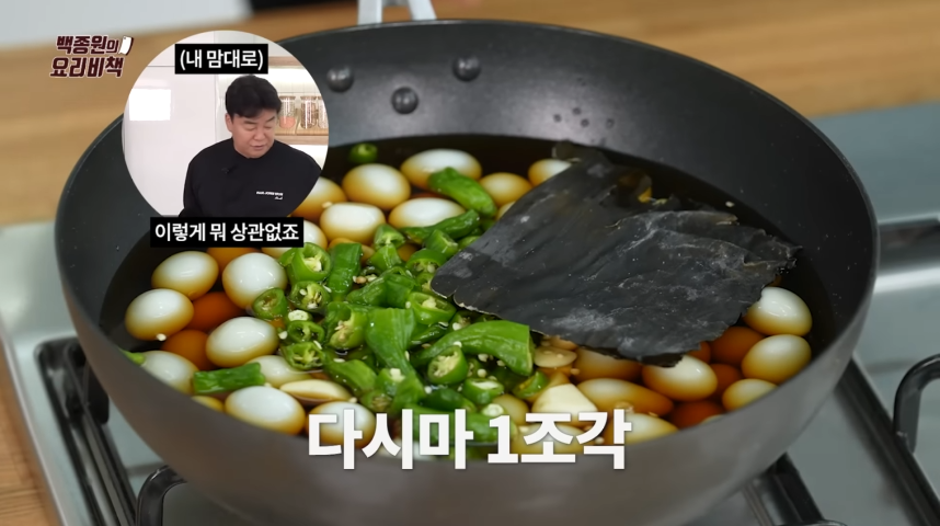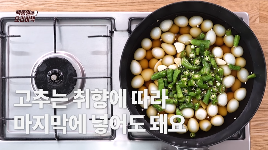 깊은 프라이팬이나 냄비에 메추리알, 진간장, 황설탕, 정수 물, 마늘, 꽈리고추, 청양고추, 다시마를 넣고 강 불에 올린다.