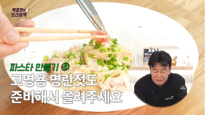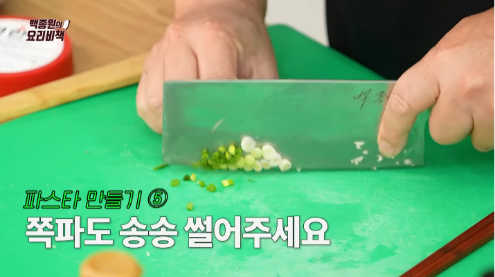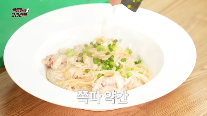 쪽파를 두께 0.3cm로 송송 썰어 스파게티 위에 뿌리고, 통후추 가루를 뿌린다.