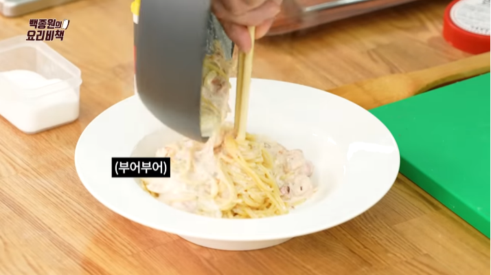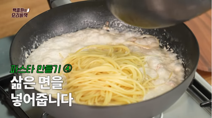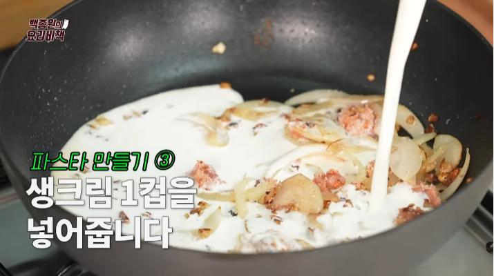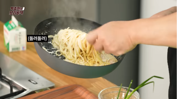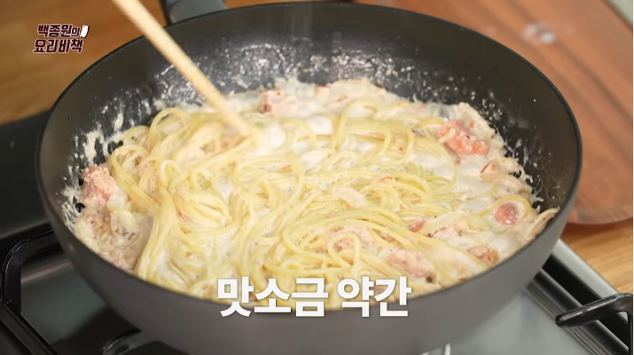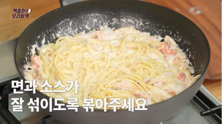 생크림을 넣고 섞어주고 삶은 면을 건져 프라이팬에 넣어 볶은 후 맛소금으로 간한다.