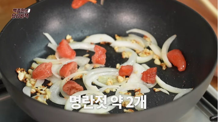 양파와 마늘이 갈색 나게 볶아지면 명란젓을 넣고 풀어지지 않도록 볶는다.