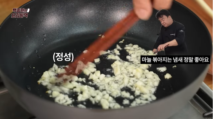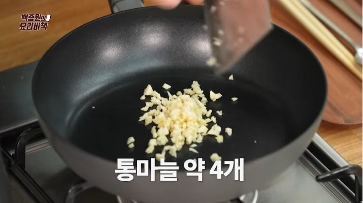 프라이팬에 식용유를 두른 후 마늘을 넣고 볶는다.