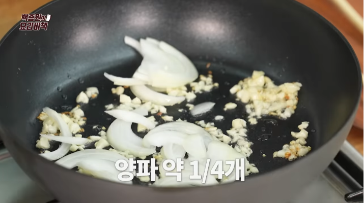 마늘이 노릇노릇 해지기 시작하면 양파를 넣고 함께 볶는다.