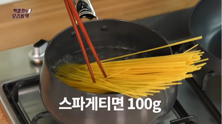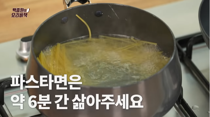 물이 바글바글 끓어오르면 스파게티면을 넣고 약 6분 삶은 후 불을 끄고 면수에 그대로 담가 둔다.