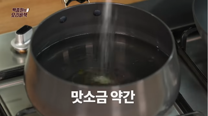 냄비에 정수물, 맛소금, 올리브 오일을 넣고 강 불에 올려 끓인다.
