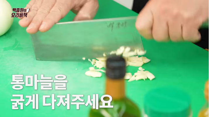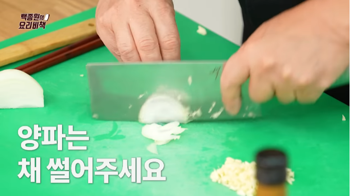 마늘은 꼭지를 제거한 후 굵게 다지고 양파는 두께 0.3cm로 채 썰어 준비한다.