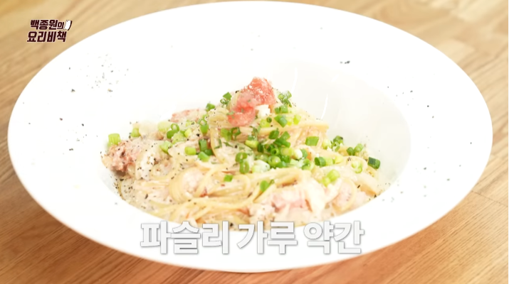 고명용 명란젓을 잘게 잘라 올리고 파르메산치즈가루, 파슬리가루를 뿌려 완성한다.