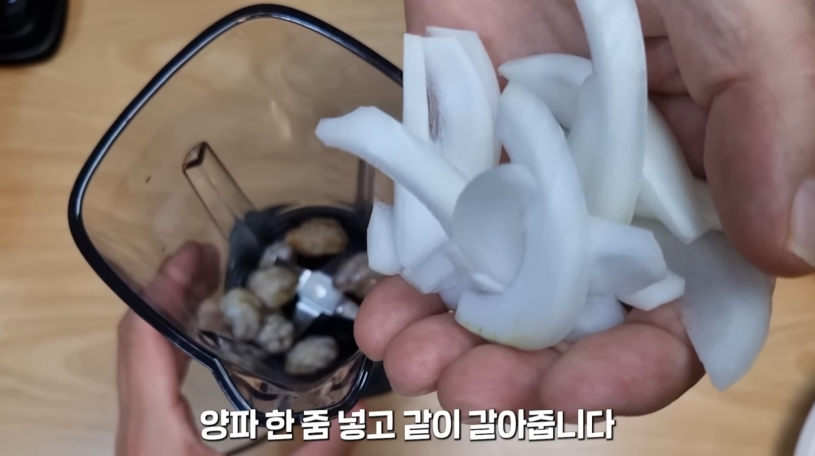 2. 만득이와 양파를 믹서기에 갈아줍니다.