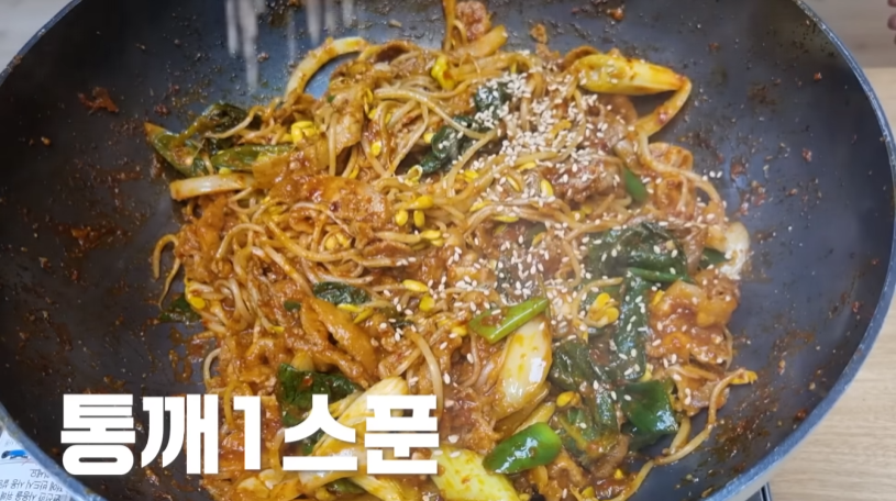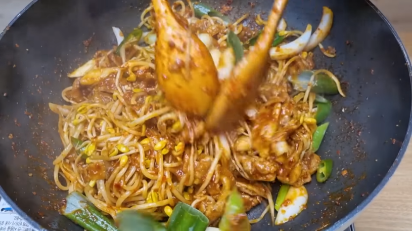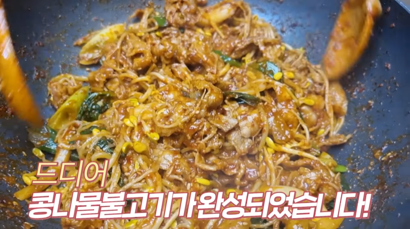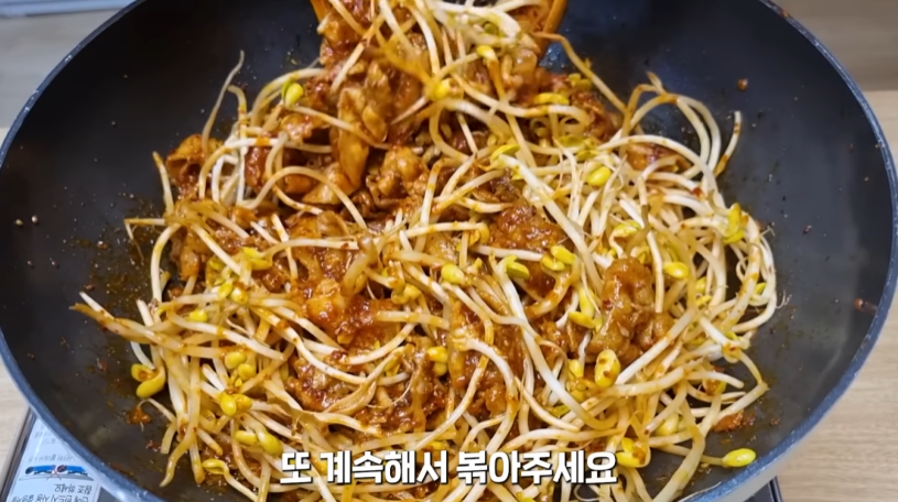 7. 살짝 볶은 다음 강불에 콩나물을 넣고 천천히 볶아줍니다.