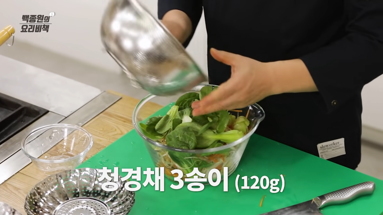 청경채는 길게 4등분으로 자르거나 꼭지를 제거하여 낱장으로 준비한 후 물에 세척하고, 숙주는 흐르는 물에 세척해 준다.