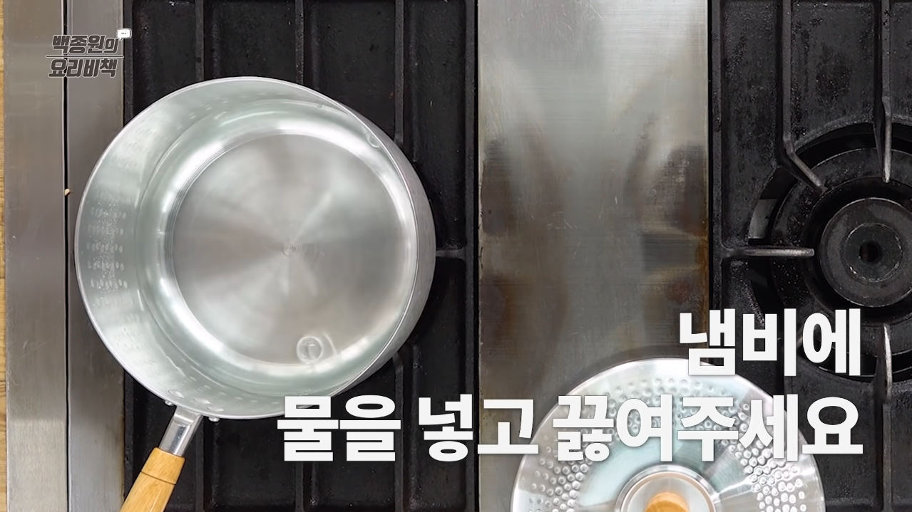 찜기에 삼발이가 잠기지 않을 정도의 물을 받아 올리고 물을 끓여준다.