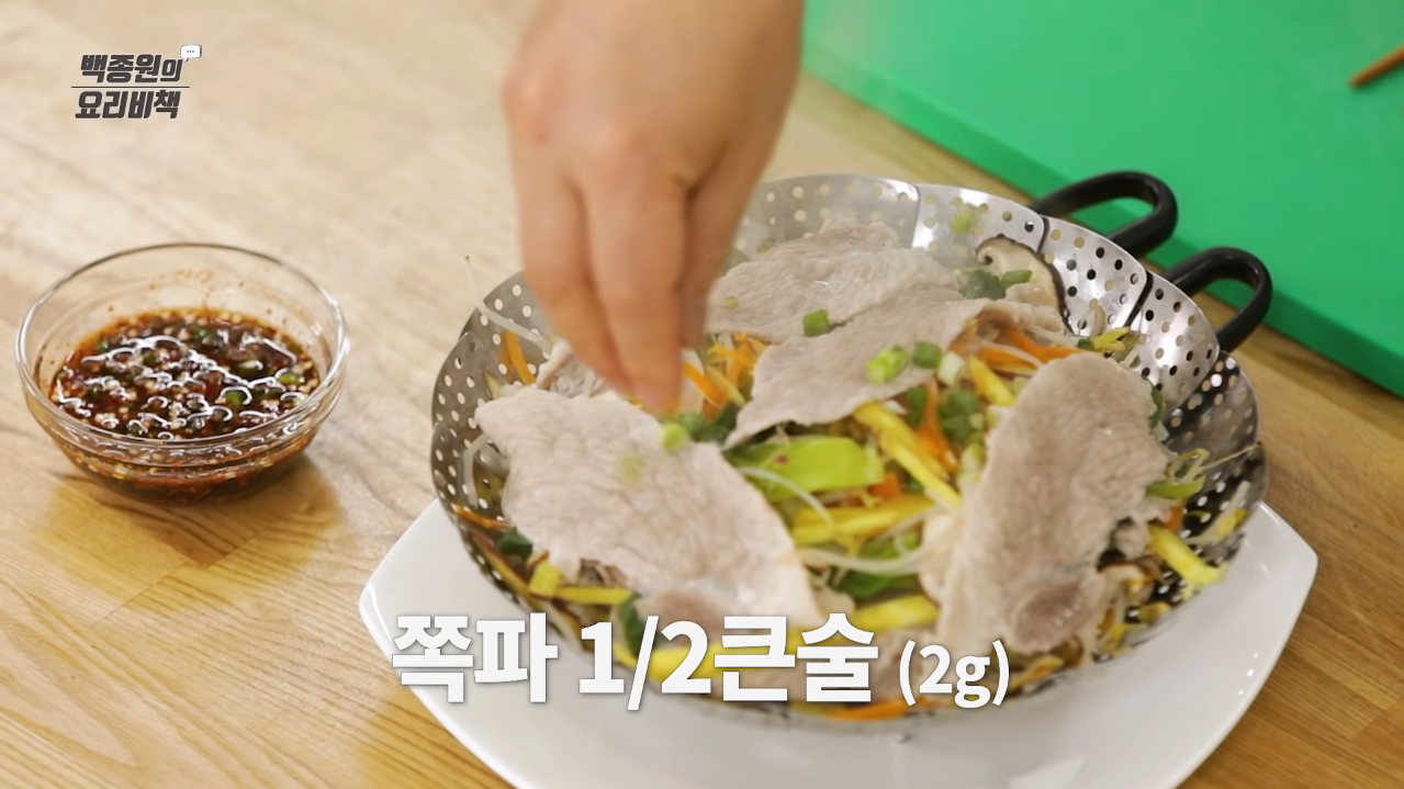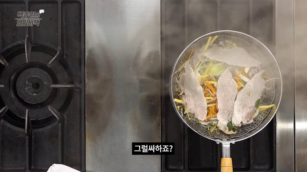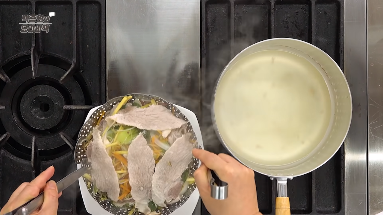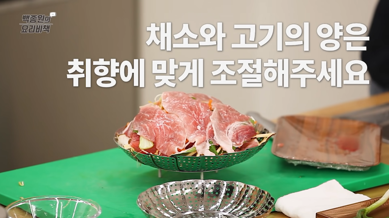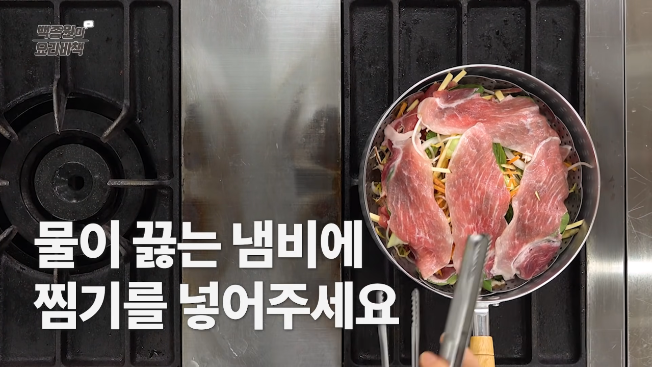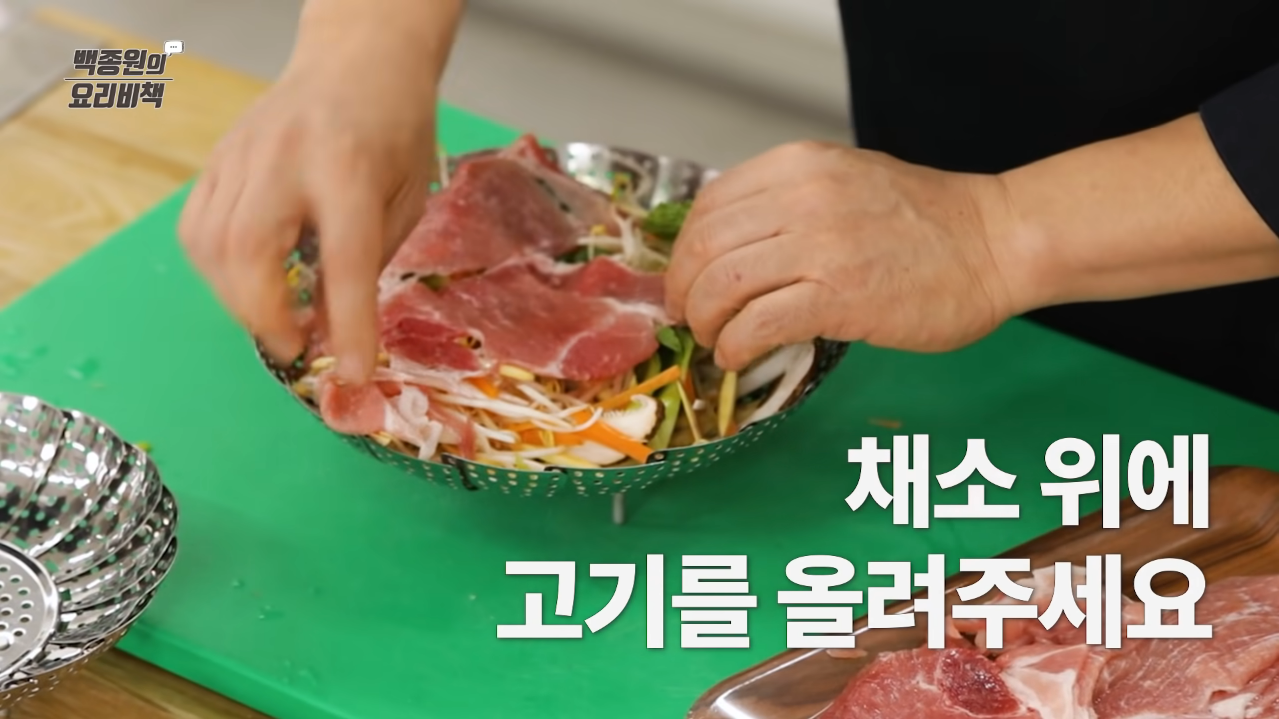 채소와 돼지고기를 층층이 쌓아 준비해놓은 삼발이를 끓는 물에 넣어 뚜껑을 닫고 약 7분간 쪄준다.