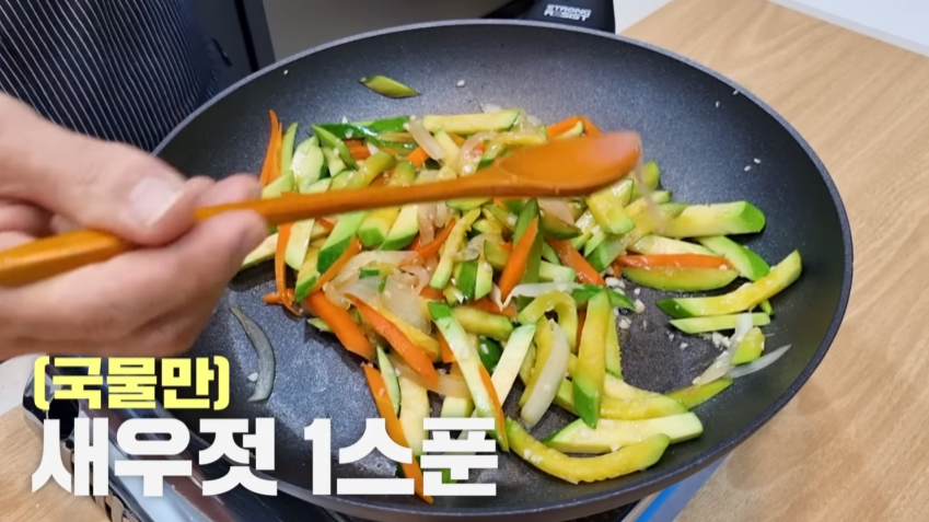 9. 불을 높여주고 새우젓을 넣고 볶아줍니다.