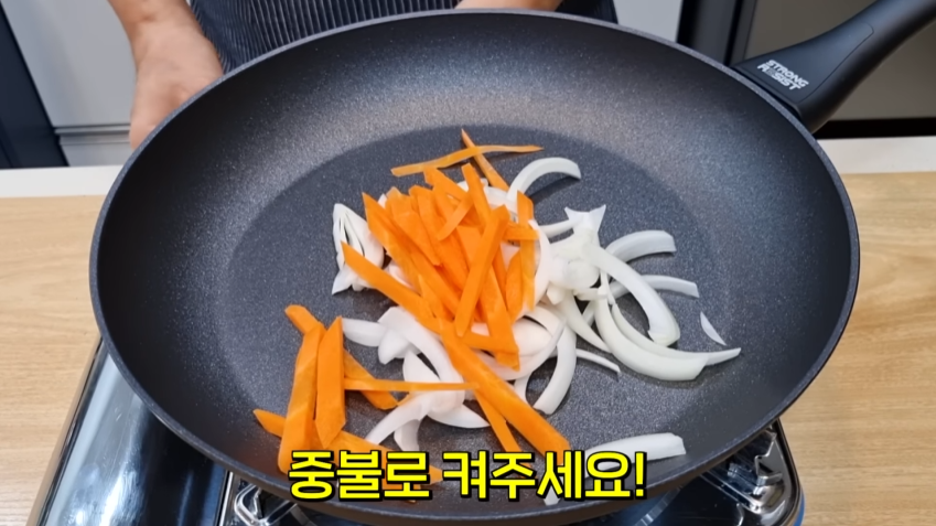1. 양파를 썰어 먹기 좋게 펴서 펜에 넣어줍니다.