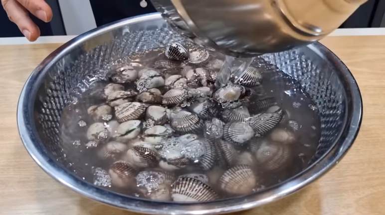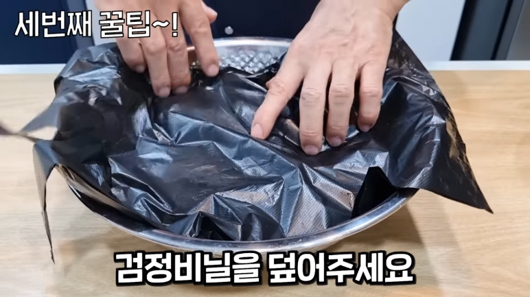 2. 씻지않은 꼬막에 소금물을 붙고 검정비닐을 덮고 뚜껑을 덮어 2시간을 기다립니다.