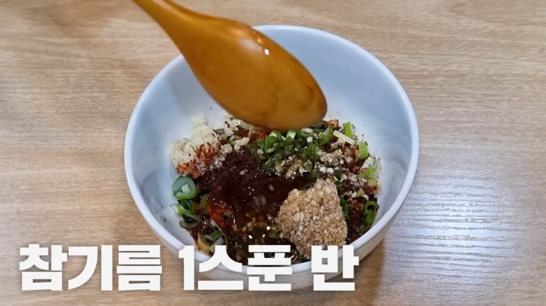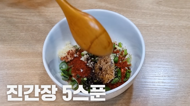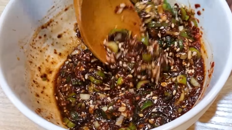 4. 대파 15cm, 고춧가루 2스푼(깎아서), 설탕 1스푼, 물 1스푼, 청양고추 1개, 진간장 5스푼, 다진 마늘 1스푼, 통깨 1스푼, 참기름 1스푼 반을 넣고 잘 섞어줍니다.