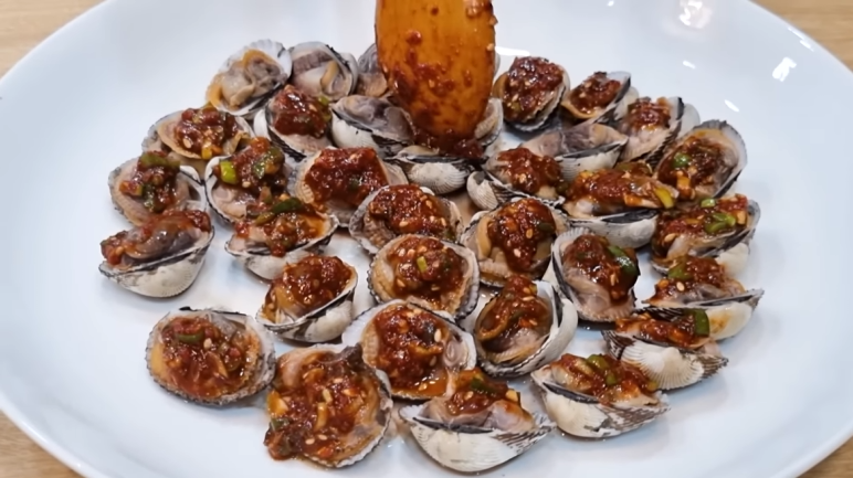7. 꼬막을 까서 접시에 답고 양념장을 발라줍니다.