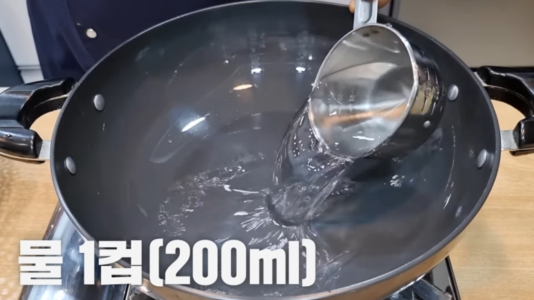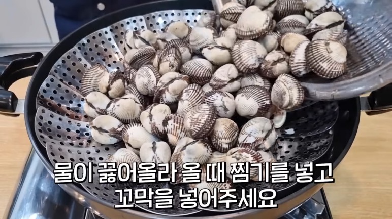 5. 물 200ml를 넣고 물이 끓어올라 올 때 찜기를 넣고 꼬막을 넣어줍니다.