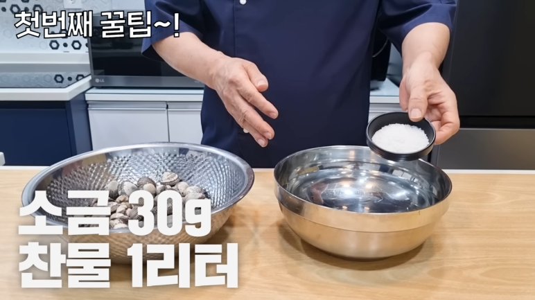 1. 찬물 1리터에 소금 30g을 넣고 충분히 저어줍니다.