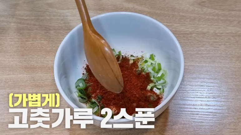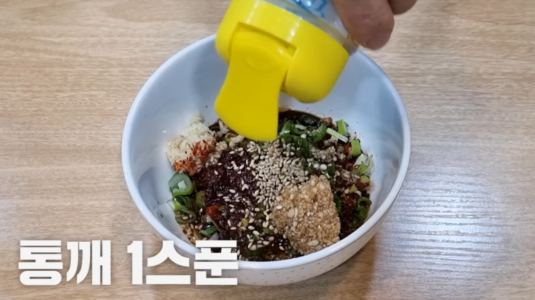 대파 15cm, 고춧가루 2스푼(깍아서), 설탕 1스푼, 물 1스푼, 청양고추 1개, 진간장 5스푼, 다진 마늘 1스푼, 통깨 1스푼, 참기름 1스푼 반