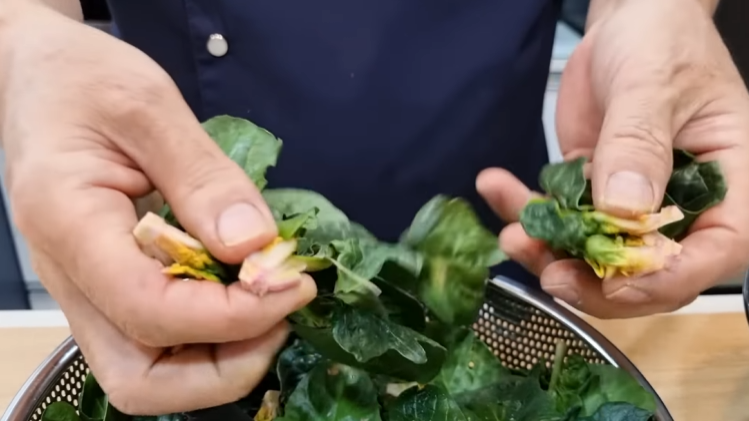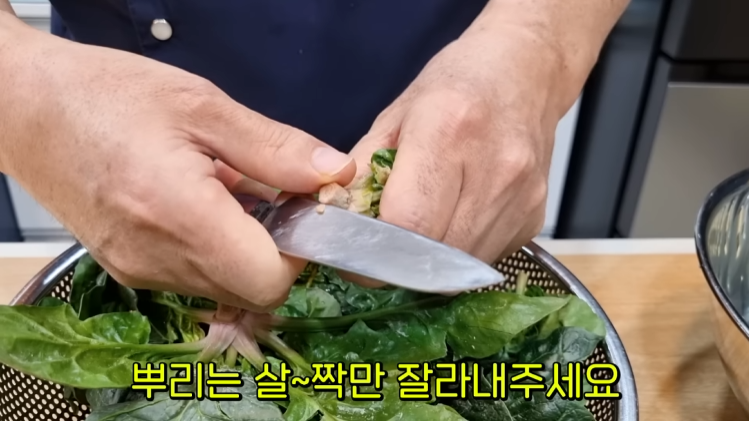 1. 시금치 뿌리 부분은 살짝 잘라주고 뿌리를 칼로 긁어줍니다.