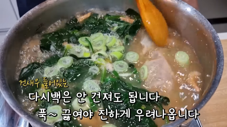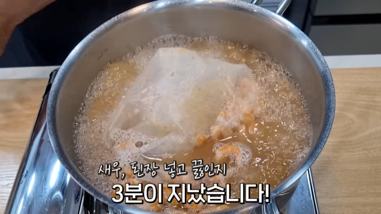 4. 건새우를 30초가량 전자레인지에 돌리고 반은 그냥 넣고 반은 다시백에 넣어 끓여줍니다.