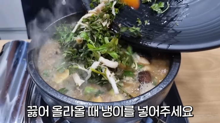 9. 끓어 올라올 때 냉이, 양파를 넣어줍니다.