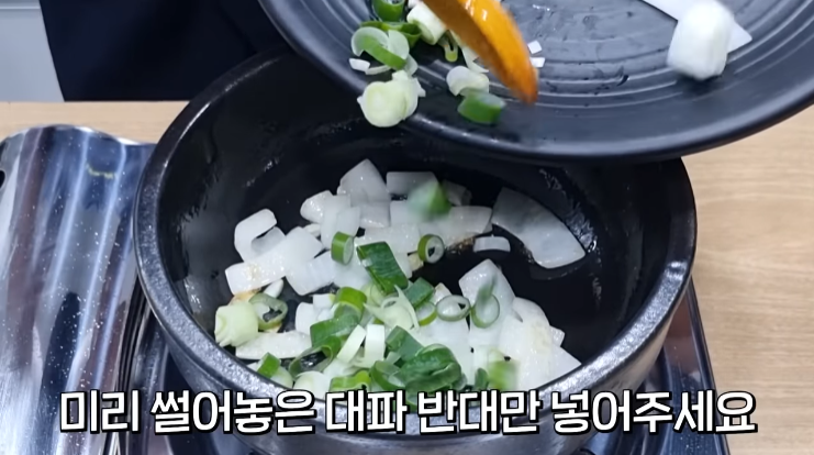 4. 뚝배기를 가열하고 식용유 1스푼을 넣고 양파를 노릇노릇 볶아줍니다.