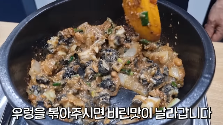 6. 물 2스푼, 합동된장 2스푼, 3년 발효된장 1스푼, 우렁 80g를 넣고 볶아줍니다.
