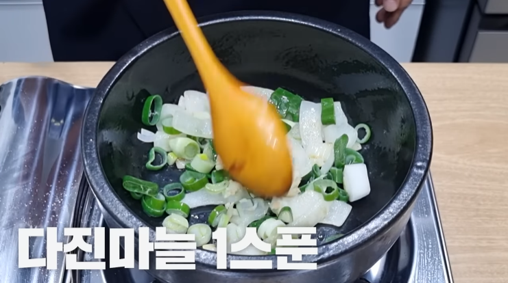 5. 대파 반대, 다진 마늘 1스푼을 넣고 볶아줍니다.