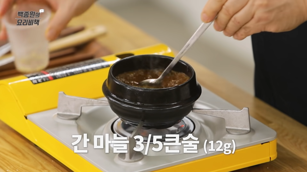 불을 줄여 준 후, 끓는 강된장에 황설탕, 간 마늘, 굵은 고춧가루를 넣고 섞는다.