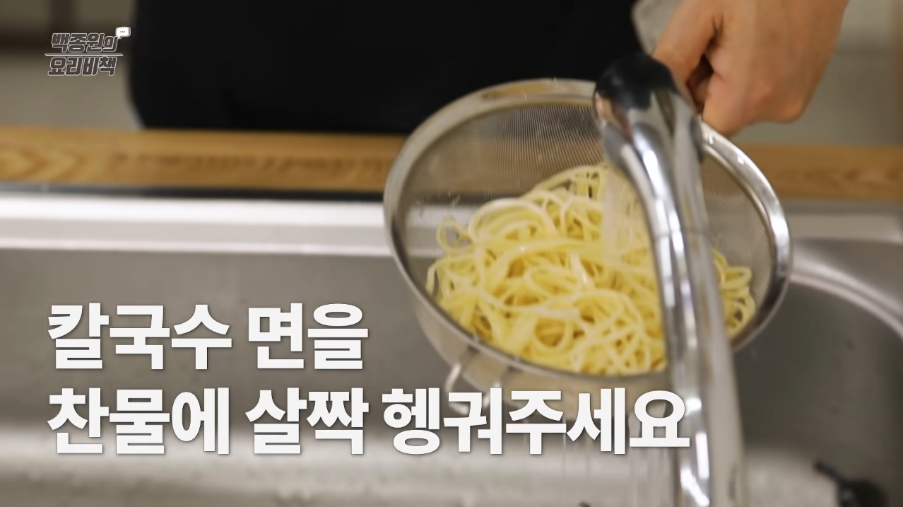 칼국수 면은 체에 밭쳐 끊어지지 않게 풀어 흐르는 찬물에 헹군다.