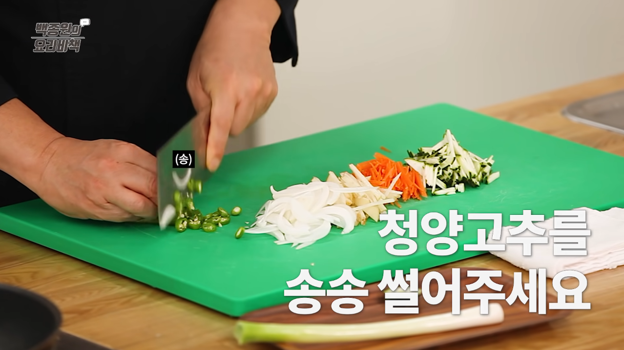 칼국수 면이 익을 때쯤 청양고추, 대파를 넣는다.