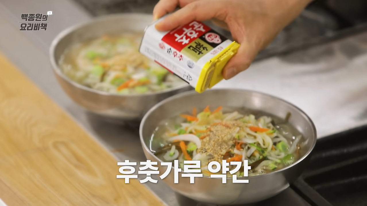 칼국수를 완성 그릇에 옮겨 담고 깨소금, 후춧가루를 뿌려 완성한다.