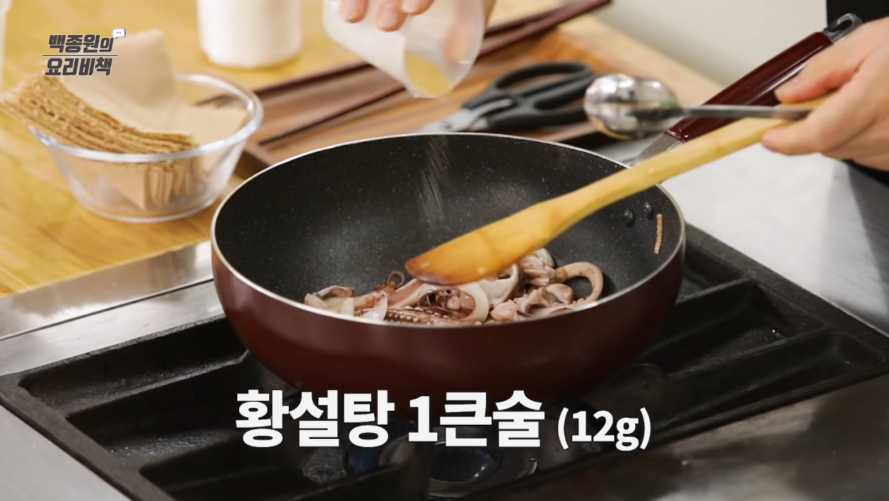 오징어가 익으면서 물이 생기면 황설탕을 넣고 볶아 풍미를 살린다.