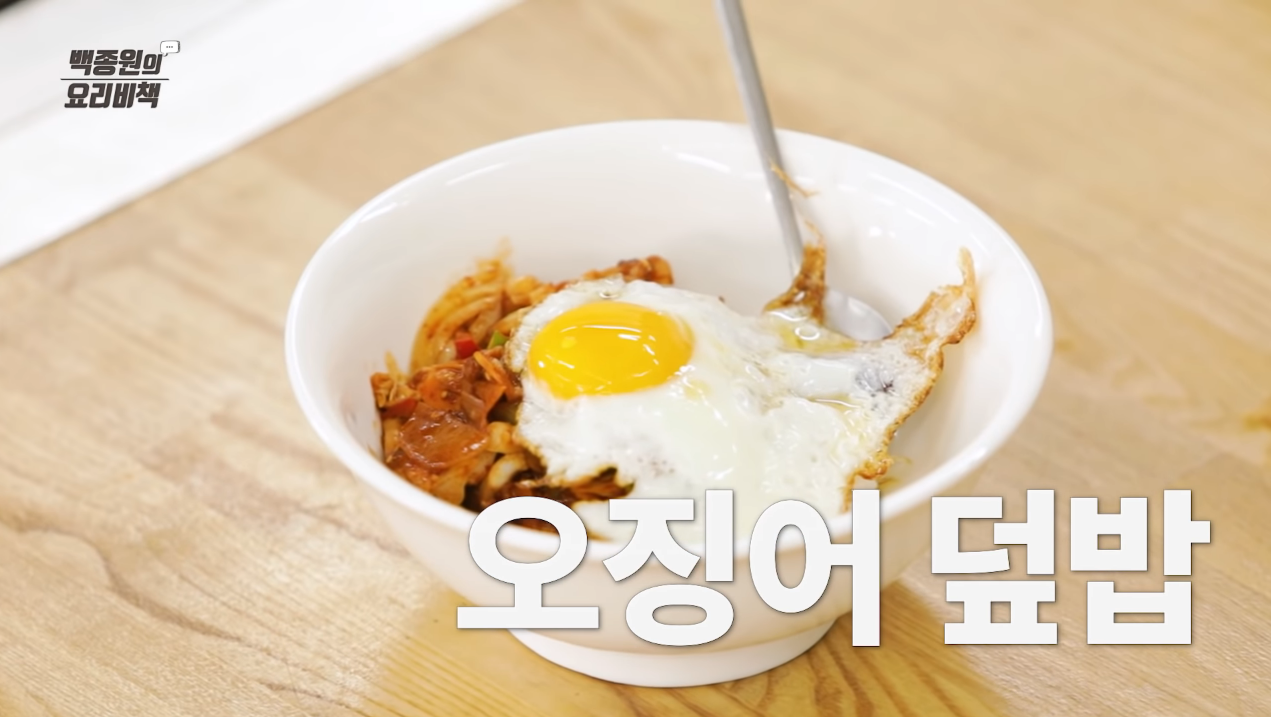 오징어볶음 위에 고추장, 달걀 후라이를 올리고 참기름을 뿌려 오징어 덮밥을 완성한다.