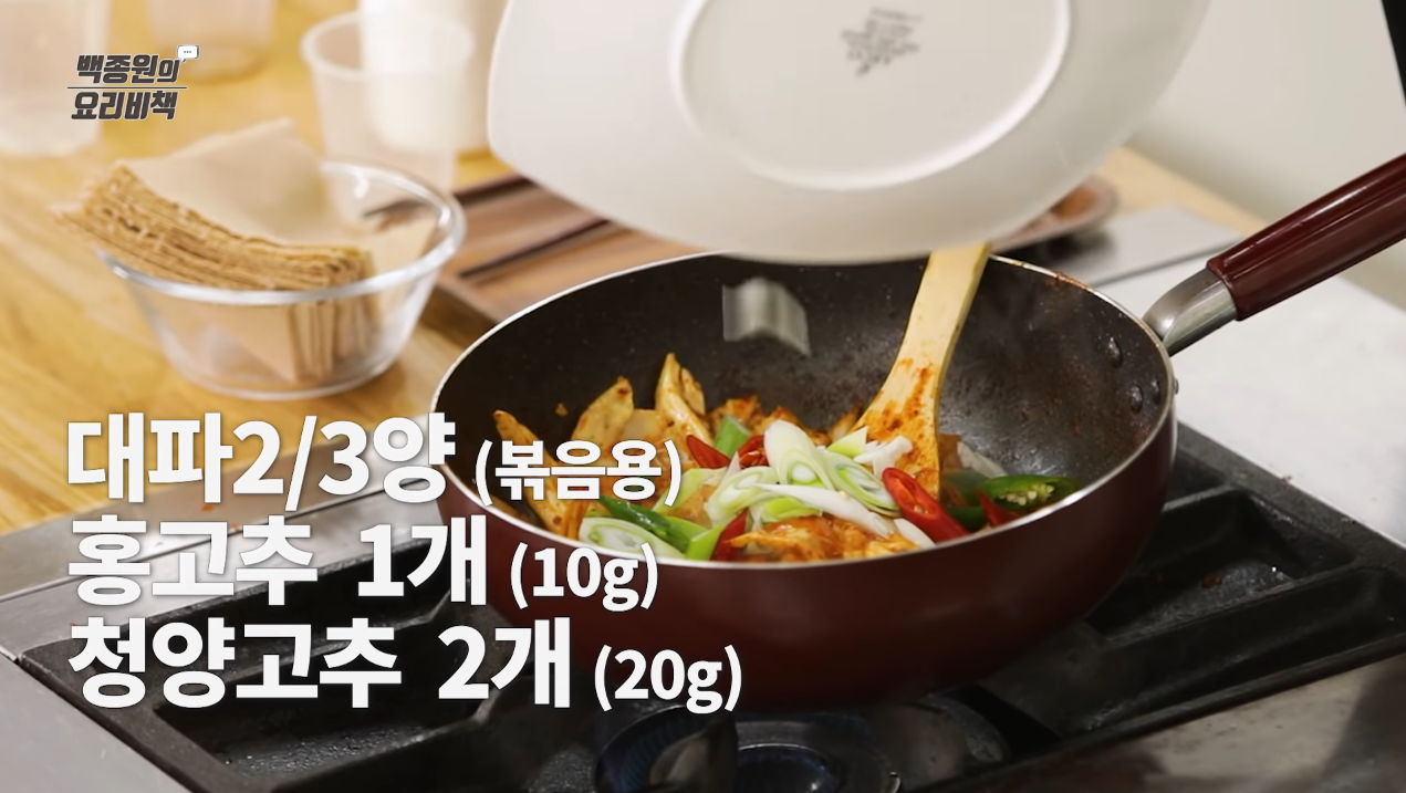 넓은 팬을 불에 올리고 식용유, 송송 썬 대파를 넣어 볶으면서 파기름을 만든다.