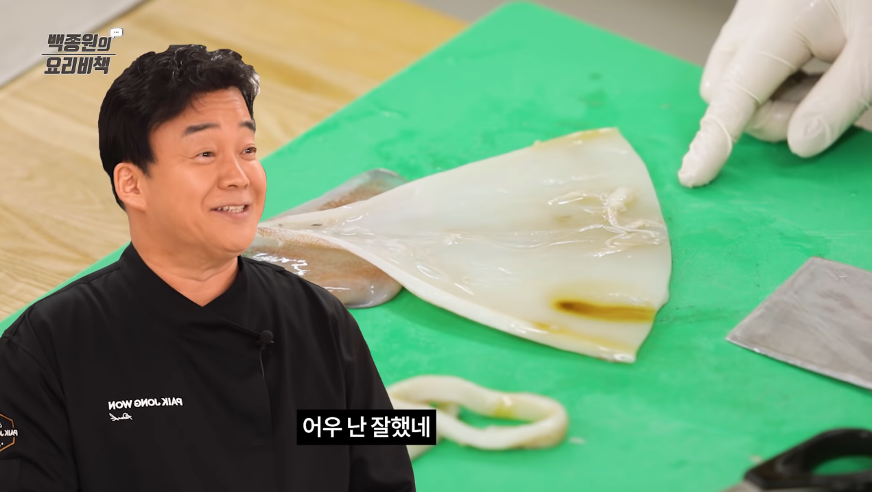 Tip: 껍질을 제거하지 않은 오징어는 표면이 미끄럽기 때문에 칼질할 때 조심해서 썬다.