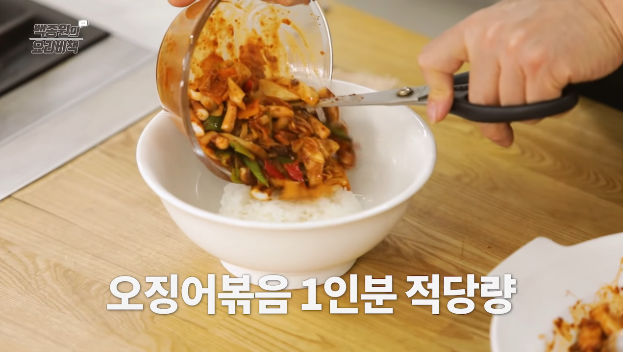 오징어볶음은 가위를 사용해 먹기 좋은 크기로 자른 후 밥 위에 담는다.