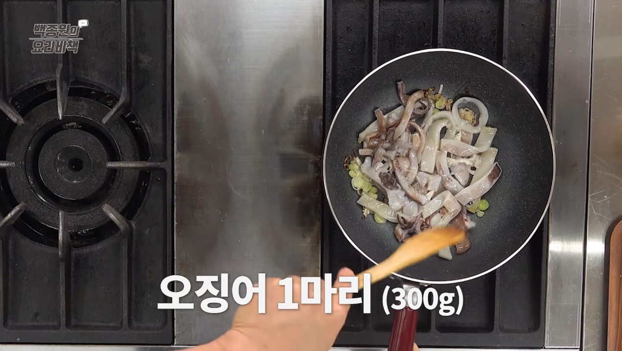 대파가 노릇해지면 오징어를 넣어 볶는다.