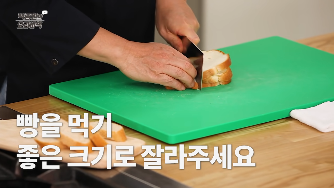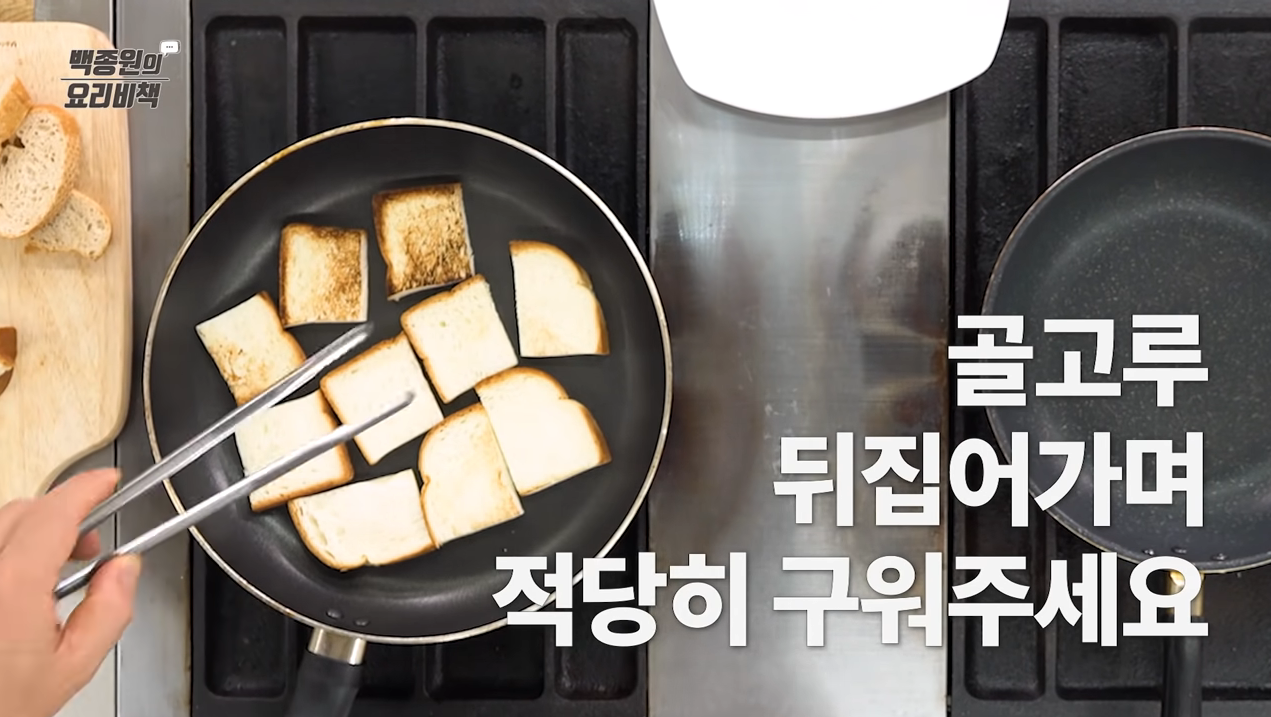 바게트와 식빵을 먹기 좋은 크기로 자르고, 팬에 노릇하게 구워 준비한다.