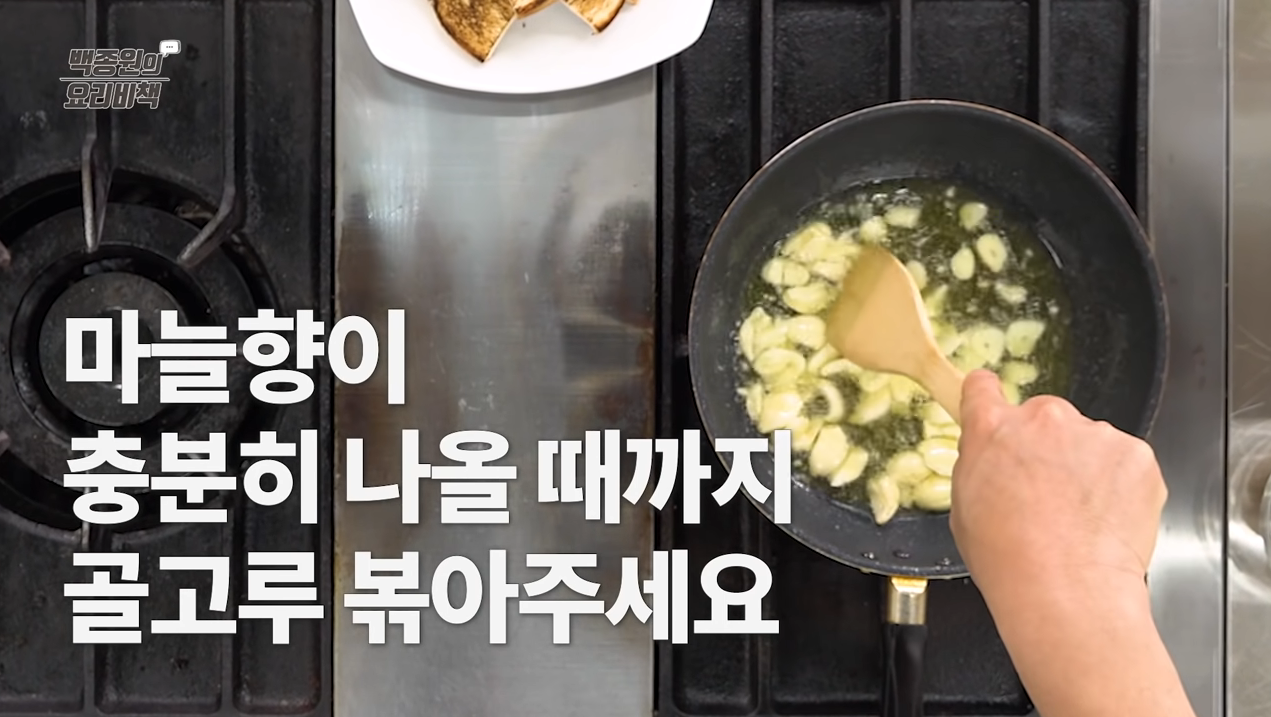 팬에 올리브유를 넣어주고 으깬 통마늘, 부순 베트남 고추, 맛소금을 넣고 중약 불로 마늘 오일을 뽑아주며 노릇하게 색을 내준다.