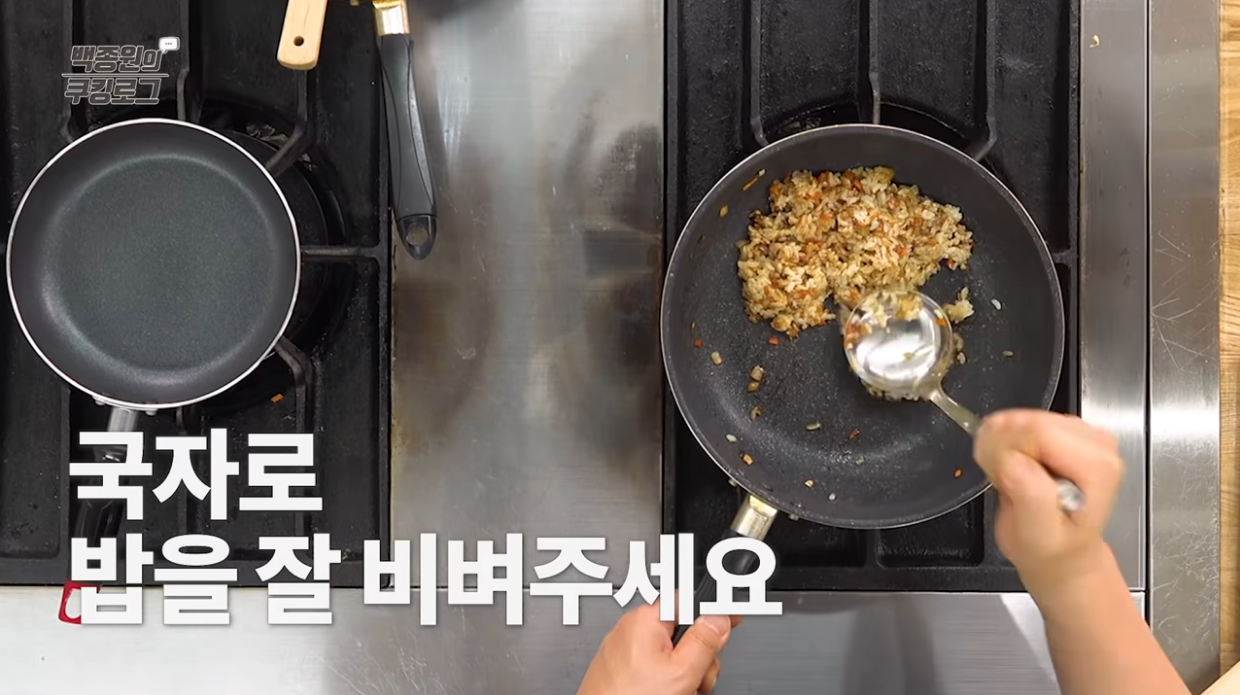 간장과 채소를 함께 볶아주고 밥을 넣어 볶은 후 후추를 뿌린다.