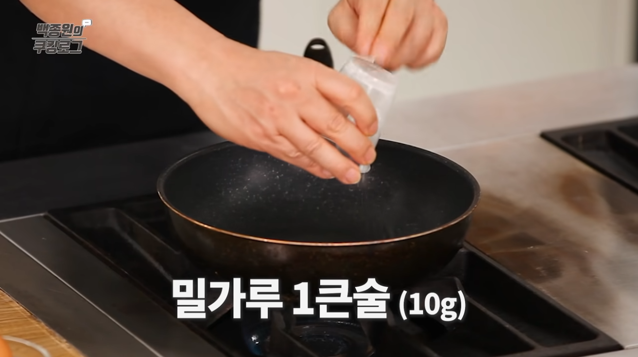 프라이팬에 식용유, 밀가루를 넣어 갈색빛 나게 볶는다.